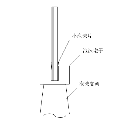 d.自制小型泡沫墩子,用于安裝被測材料樣板,如圖2所示。利用水平尺,貼合金屬板的表面,根據(jù)水平尺的指示調(diào)整小泡沫片,微調(diào)被測材料樣板的俯仰角度,將材料樣板平面垂直于地面擺放;